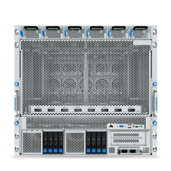 P9000IG7 (AC) 採用雙處理器與八 GPU 協同架構:雙 Intel® Xeon® 6 處理器與 HGX™ B300 八 GPU 系統協同運作,釋放大規模並行運算能力,同時兼顧高效能與節能表現。此架構為從訓練到推理的各類人工智慧工作負載提供卓越的靈活性與速度。 採用 10U 機箱設計,至多支援 8 個 U.2 NVMe SSD,確保大型訓練資料集的高速本地存取。整合於主機板的 NVIDIA ConnectX-8 SuperNIC™ 網路卡,有效降低延遲並提升分散式環境下的吞吐量,使運算、儲存與網路緊密協作,全面支援大規模高效能人工智慧應用。 |